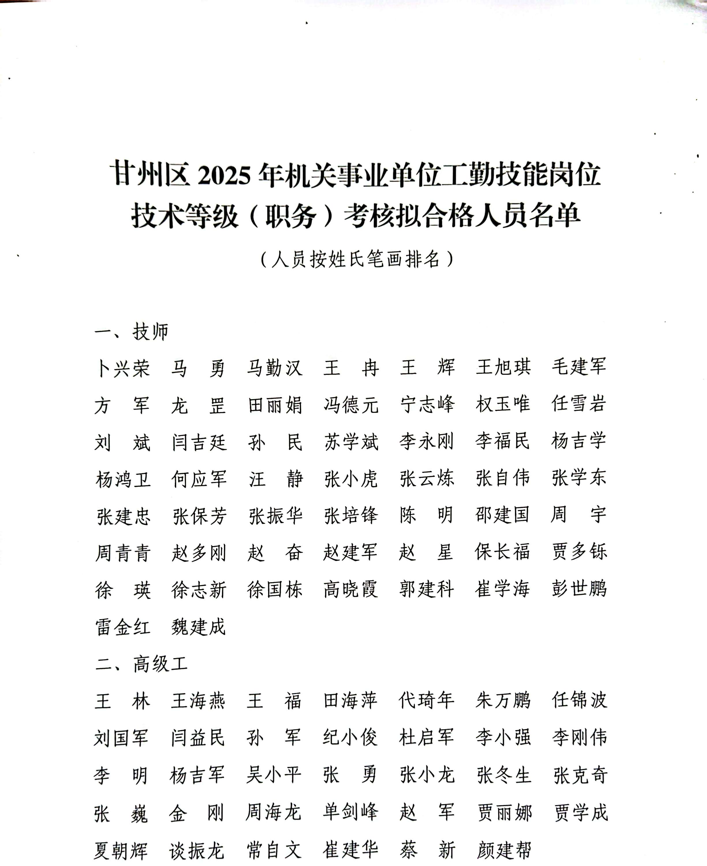 根据省人社厅《关于进一步优化全省事业单位工勤技能岗位技术等级(职务)考核工作的通知》(甘人社通〔2024〕203号)和市人社局《关于做好2025年全市机关事业单位工勤技能岗位技术等级(职务)考核工作的通知》(张人社通〔2025〕63号)精神,现将2025年甘州区机关事业单位工勤技能岗位技术等级(职务)考核拟合格人员予以公示,接受社会监督。