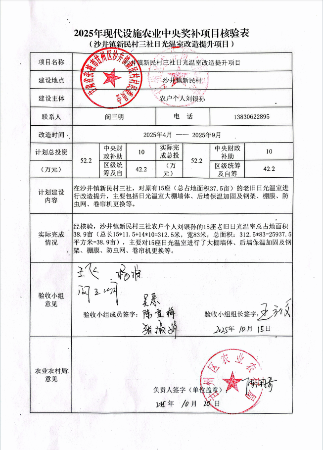 在接到张掖市丝路春雨农业科技有限公司及农户个人刘银孙的验收申请后,我局于2025年10月15日组织人员,对沙井镇新民村三社日光温室改造提升项目及张掖市丝路春雨农业科技有限公司2025年老旧设施农业改造提升中央奖补项目进行了县级验收。经核验,沙井镇新民村三社农户个人刘银孙的15座老旧日光温室总占地面积38.9亩(总长15*11.5+14*10=312.5米,宽83米,总面积:312.5*83=25937.5平方米=38.9亩),主要对15座日光温室进行了大棚墙体、后墙保温加固及钢架、棚膜、防虫网、卷帘机更换等;张掖市丝路春雨农业科技有限公司的100座老旧钢架大棚总占地面积67.35亩(路北总长48*8+47*1=431米,宽50米,路北总面积:431*50=21550平方米;路南总长52*8+51*1=467米,宽50米,路南总面积:467*50=23350平方米;总占地面积21550+23350=44900平方米=67.35亩),主要对100座钢架大棚进行了大棚棚膜、卷膜机的更换及部分大棚破损钢架更换维修等。为保障群众的知情权,参与权,更好地发挥群众监督作用,现将县级验收结果予以公示,并接受社会监督。