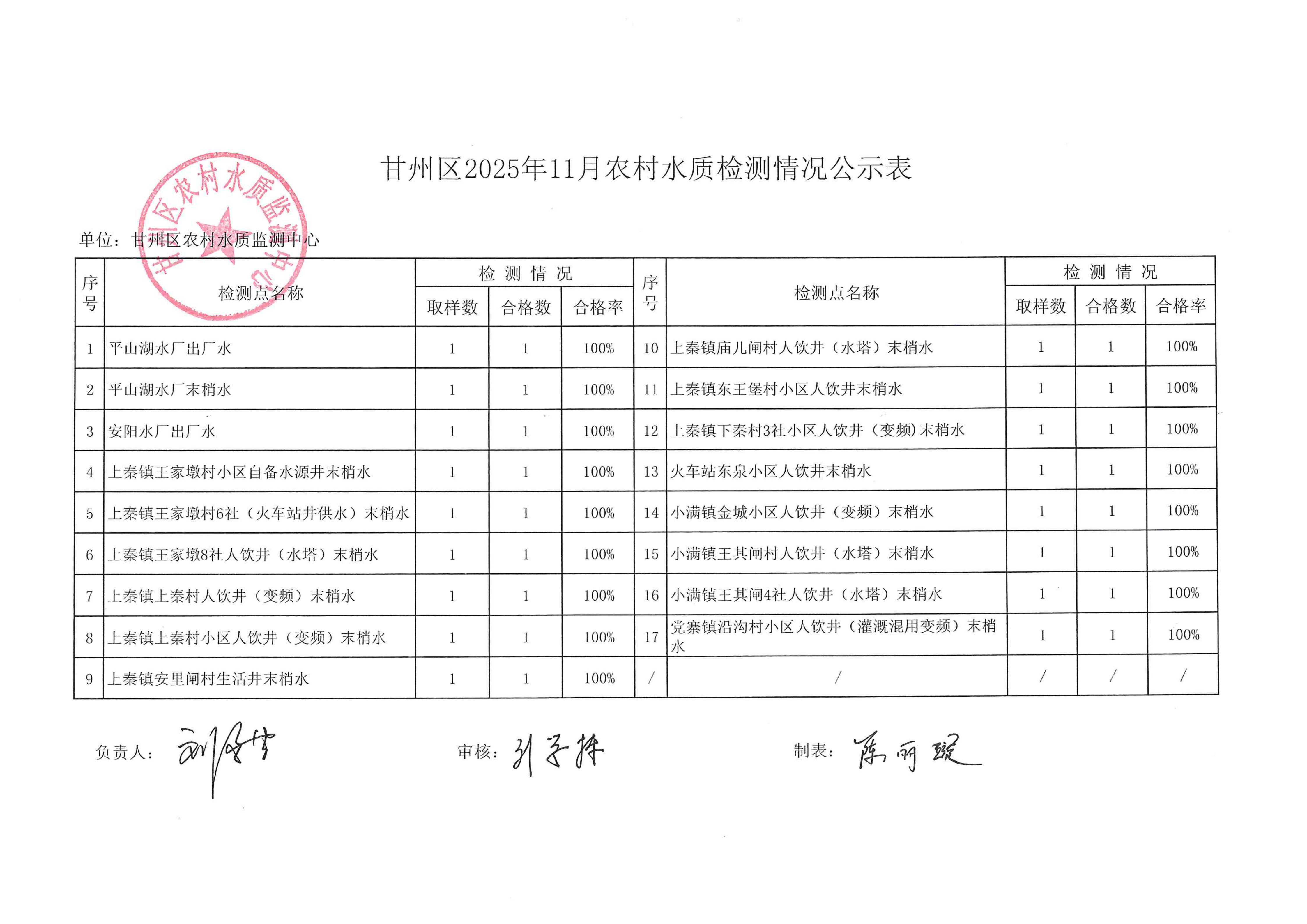 检测甘州区安阳水厂等3处农村集中供水厂出厂水、末梢水;上秦镇上秦村人饮井等14处单村供水工程末梢水,共计17个检测点。
