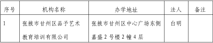 自本公示发布之日起,上述校外培训机构不得再以原注册机构名义从事任何培训活动。公示期间,如有任何单位或个人对公示情况有异议,请于公示期间以电话或书面形式向我局提出。公示无异议之后,我局对提出注销申请的张掖市甘州区品予艺术教育培训有限公司办理注销手续。