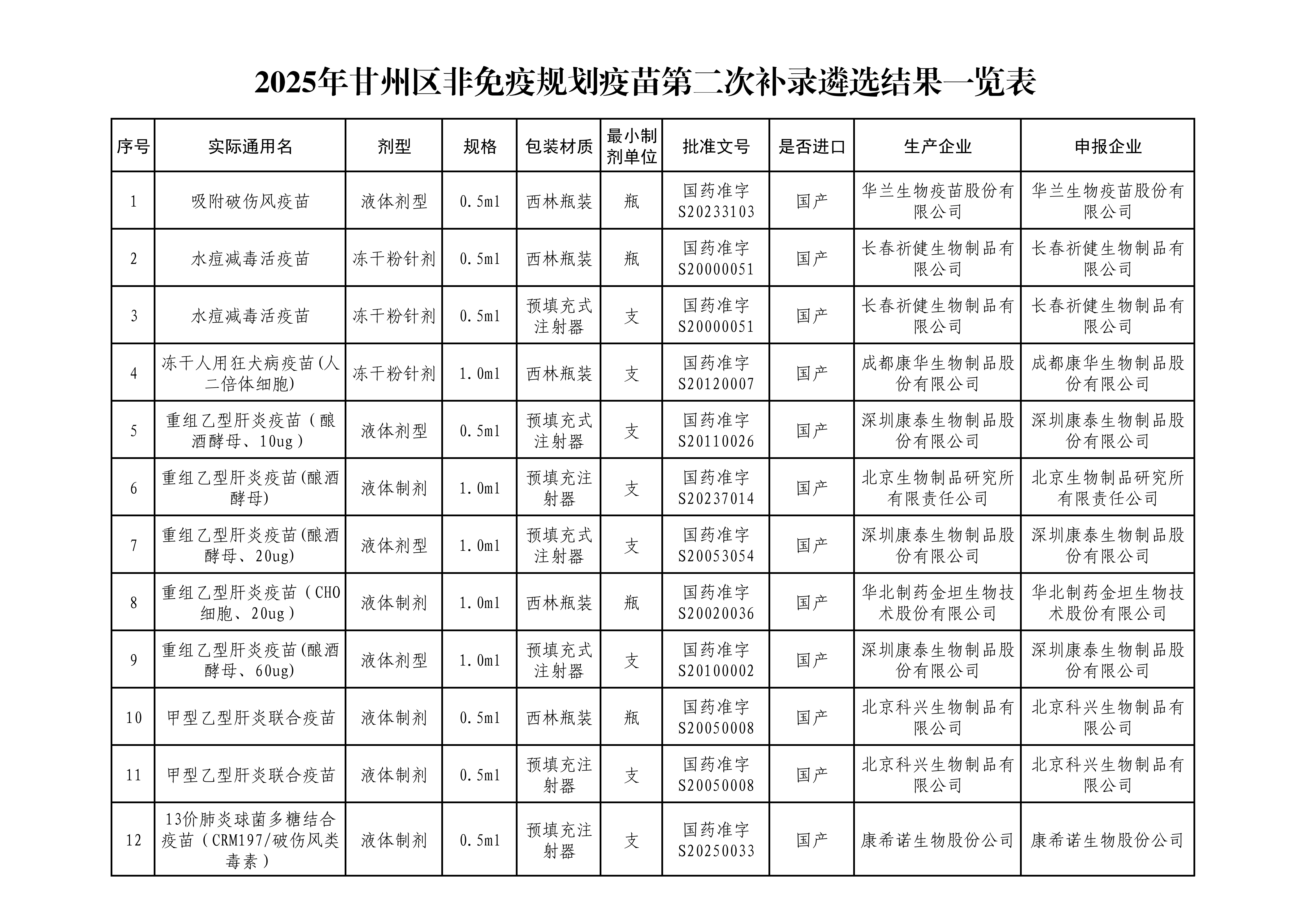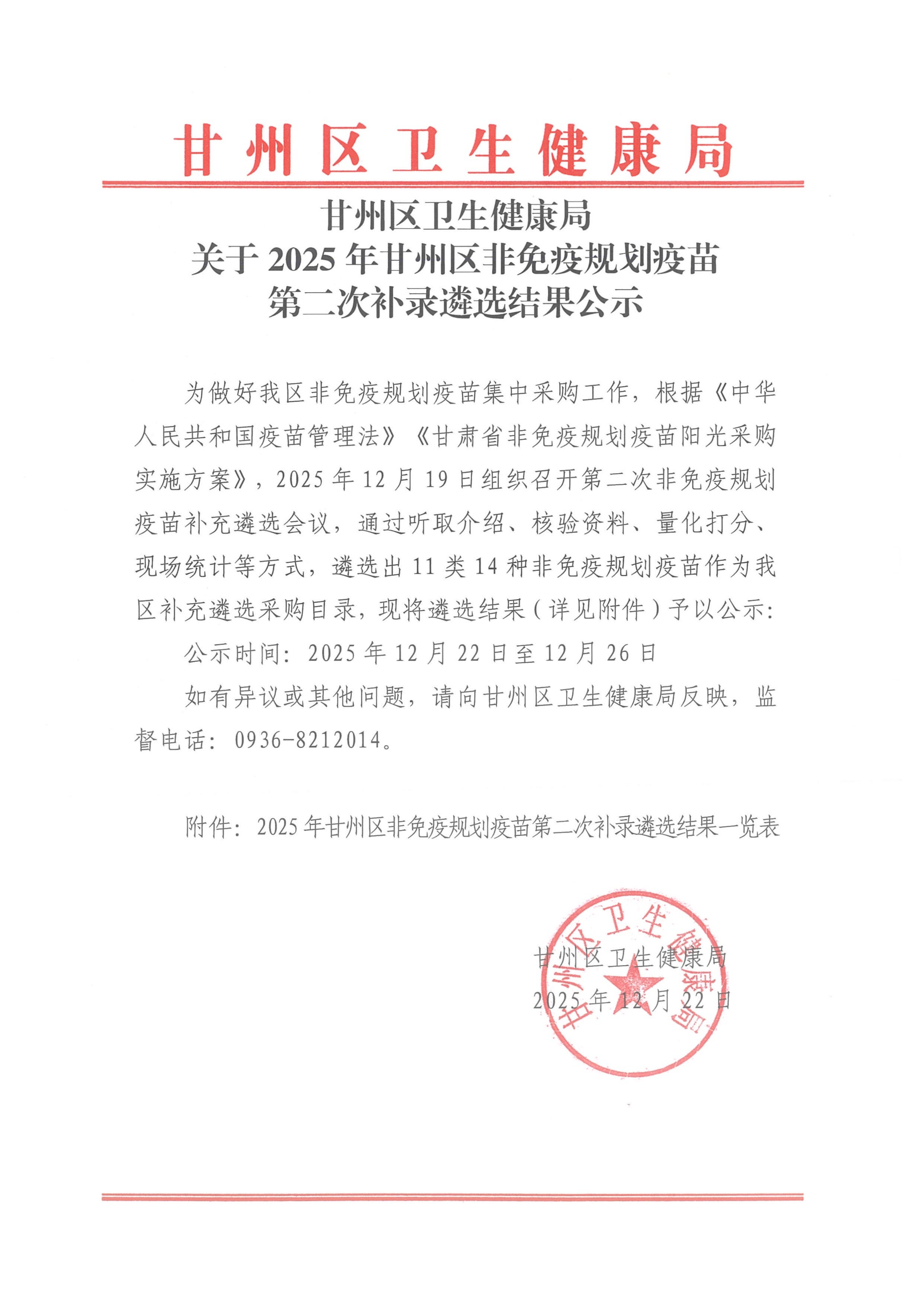 甘州区卫生健康局 关于2025年甘州区非免疫规划疫苗第二次补录遴选结果公示
