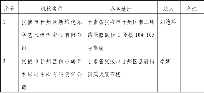 甘州区教育局关于注销张掖市甘州区新培优乐学艺术培训中心有限公司等2所校外培训机构办学许可的公示