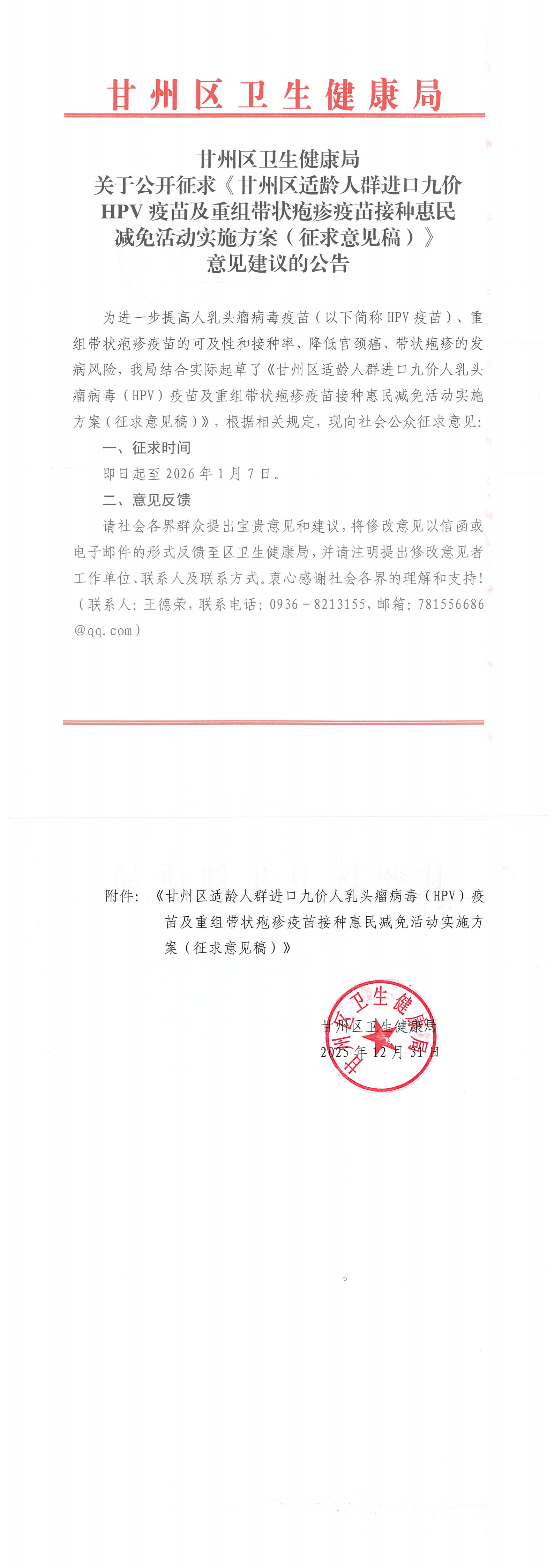 甘州区卫生健康局 关于公开征求《甘州区适龄人群进口九价HPV疫苗及重组带状疱疹疫苗接种惠民减免活动实施方案(征求意见稿)》的公告