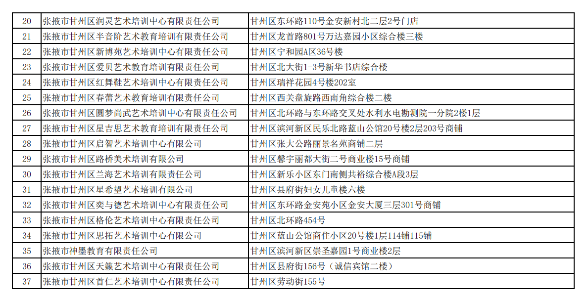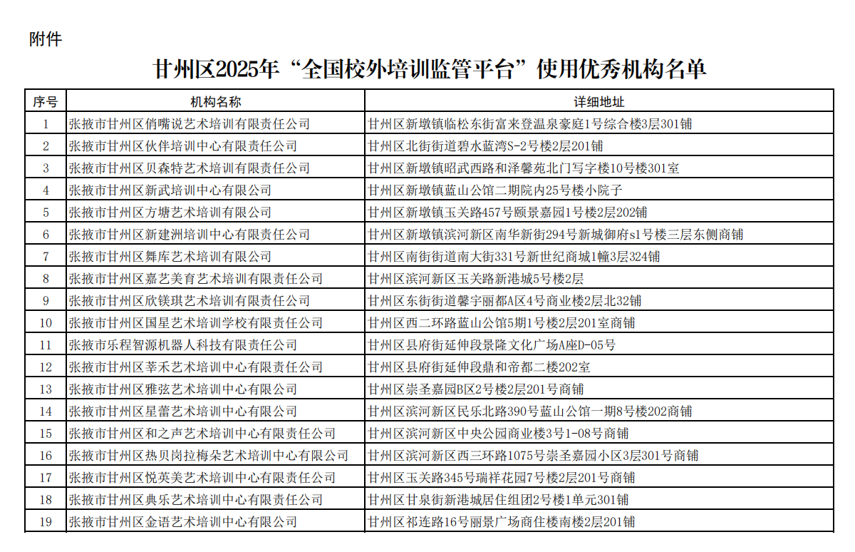 甘州区2025年“全国校外培训监管平台”使用优秀机构名单公示