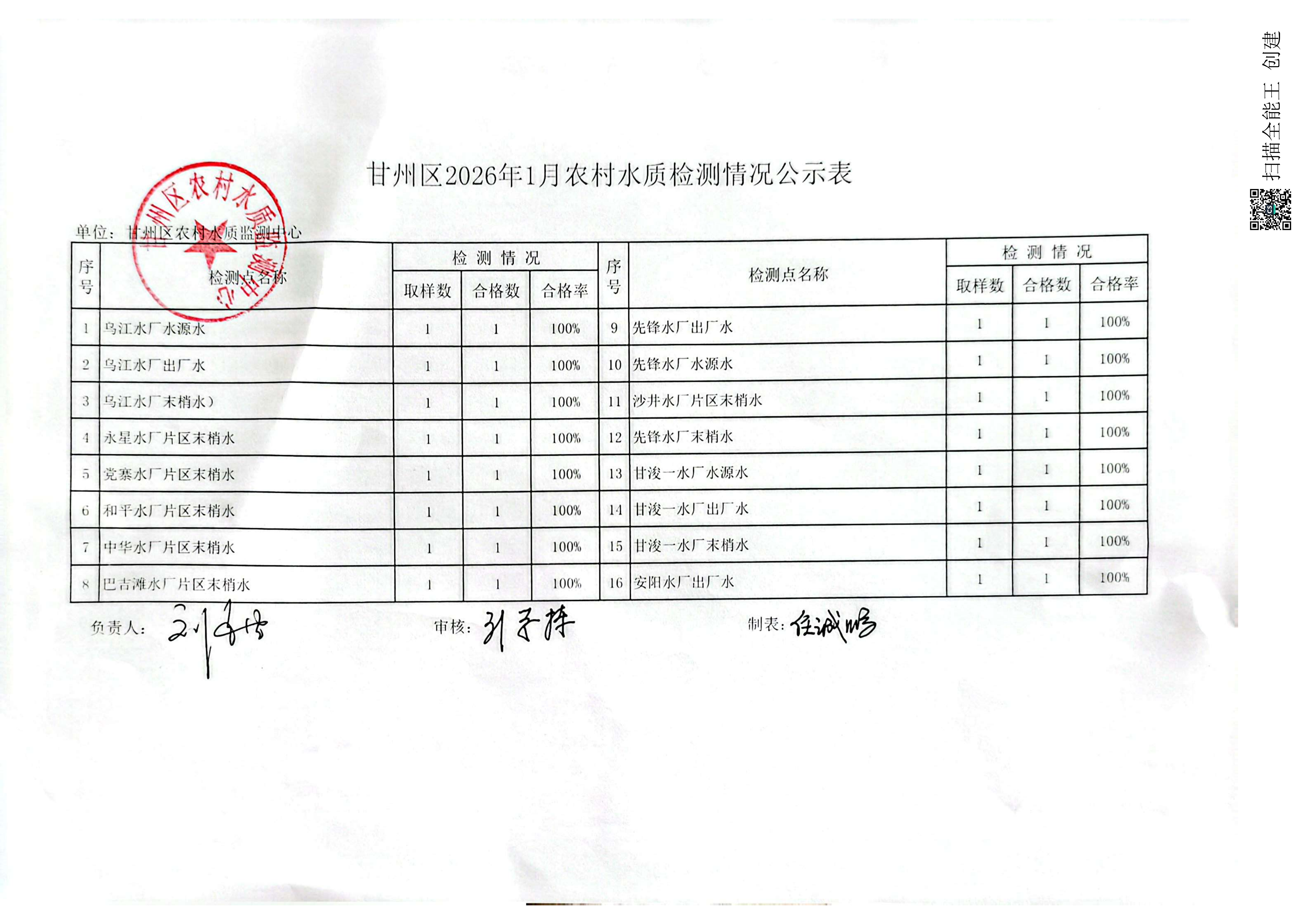 甘州区2026年1月农村水质检测情况公示