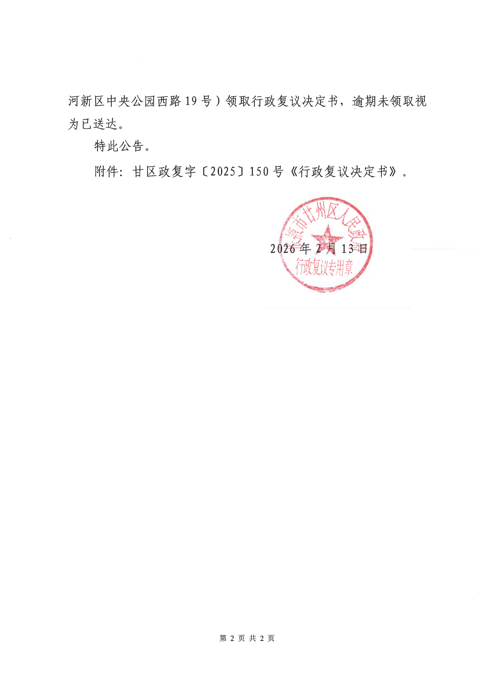 行政复议决定书送达公告