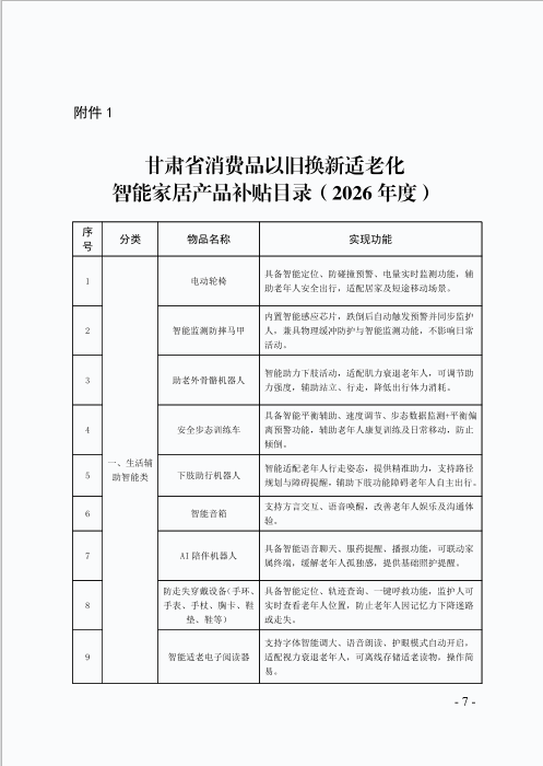 附件:1.《甘肃省消费品以旧换新适老化智能家居产品补贴目录(2026年度)》