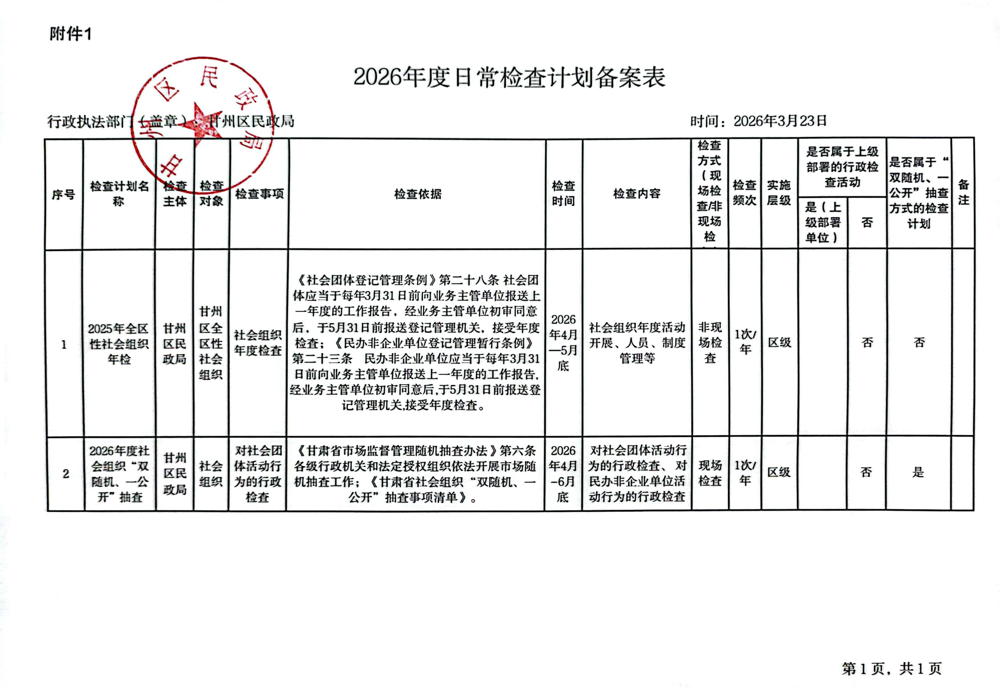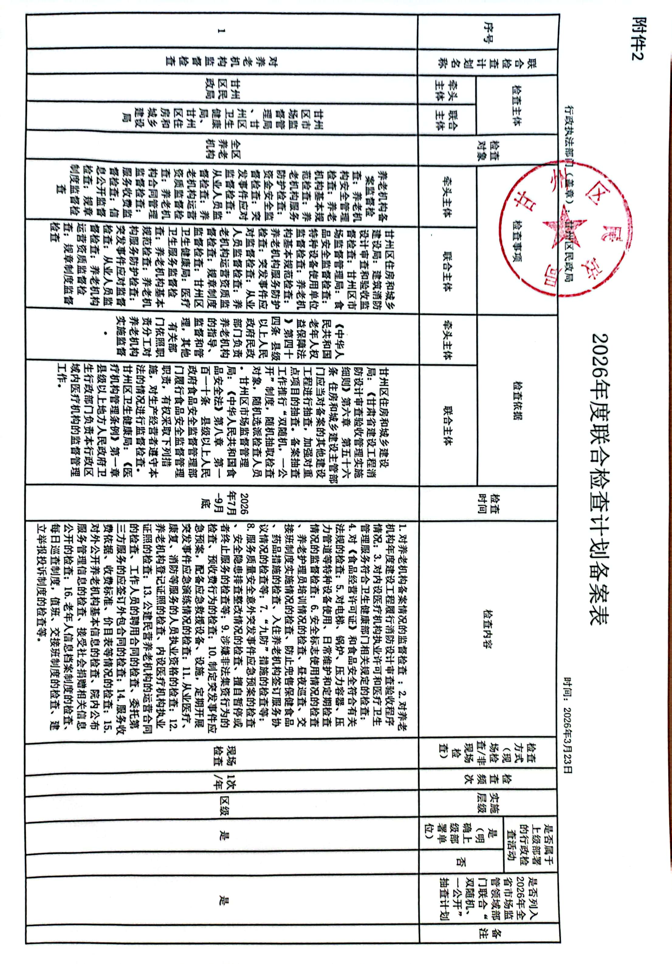 甘州区民政局2026年度行政检查计划备案表