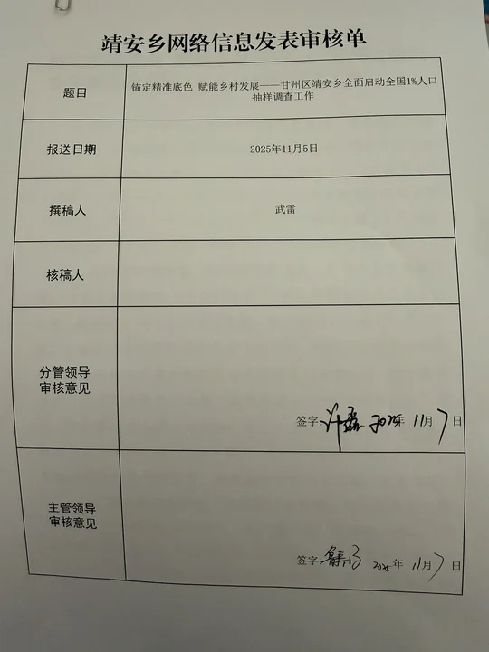 11月1日,全国1%人口抽样调查正式启动,作为精准掌握人口动态、科学谋划发展全局的重要基础性工程,甘州区靖安乡立足乡村实际、聚焦核心任务,以“系统谋划、精准发力、严督实导”三维发力,推动调查工作提质增效。此次调查为靖安乡研判乡域人口数量、结构、分布及流动趋势提供关键数据支撑,更是赋能乡村振兴、优化公共服务、提升基层治理效能的重要实践。