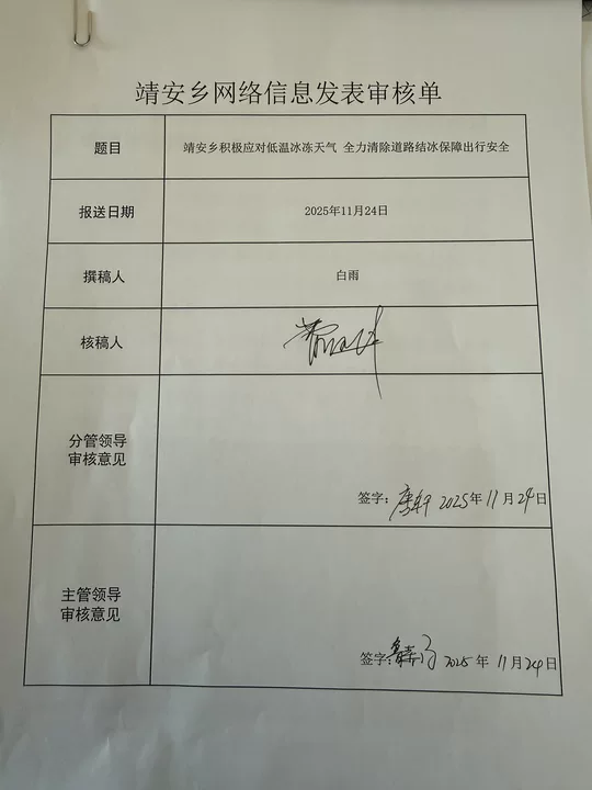 二、部门联动,合力攻坚。乡综合执法队、靖安公路段工作人员及各村委会迅速响应,组织相关人员开展除冰工作。靖安公路段人员负责省道靖安段抛洒融雪剂及砂砾;各村组织人员对交叉路口及车辆汇入路口结冰进行清理。此次行动,累计出动人员80余人次,各类机械设备2台,清理结冰主干道3公里、乡村道路2公里,有效恢复了道路通行条件。