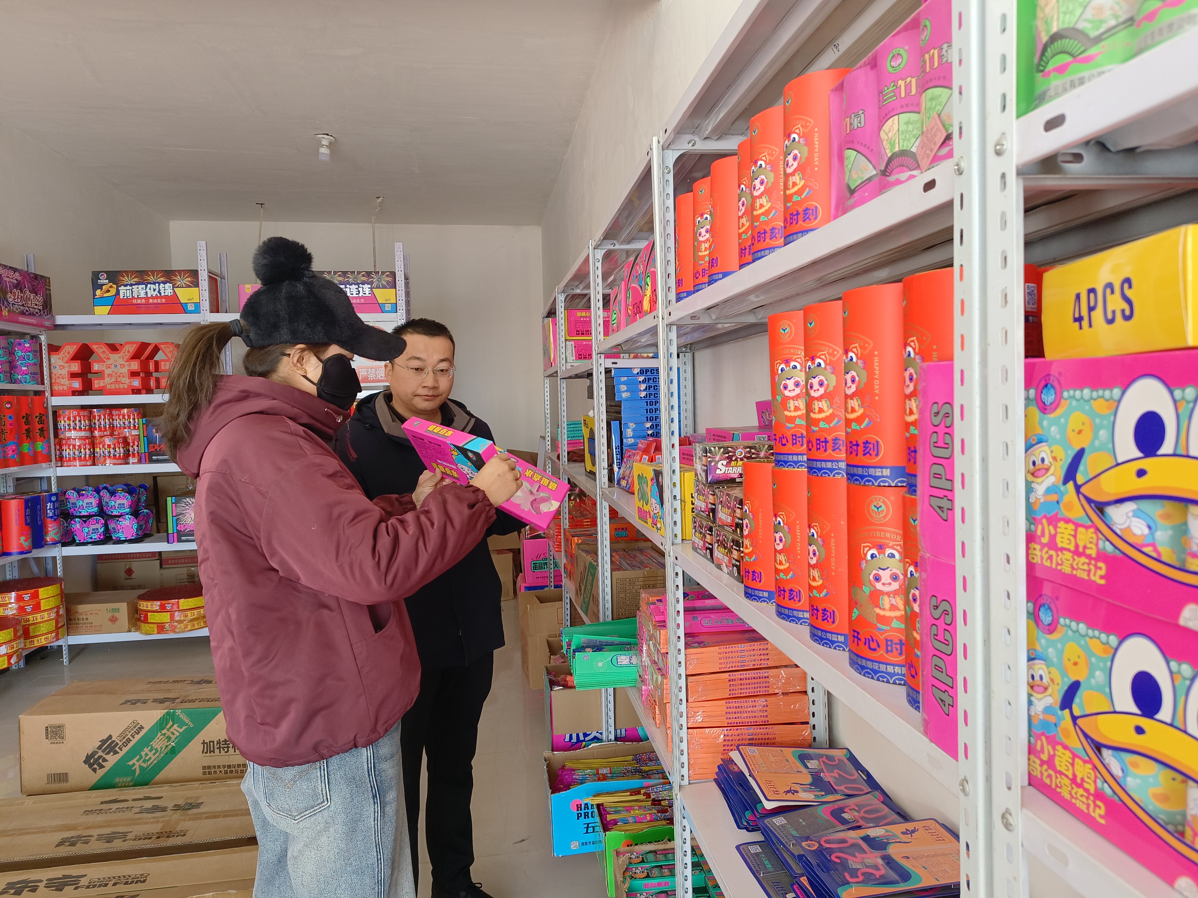 在烟花爆竹零售经营门店,检查人员逐一核查经营资质、储存条件、消防设施配备等情况,重点检查是否存在超量储存、异地经营、销售不合格产品等违法违规行为,详细查看了烟花爆竹进货台账、销售记录及安全管理制度落实情况。
