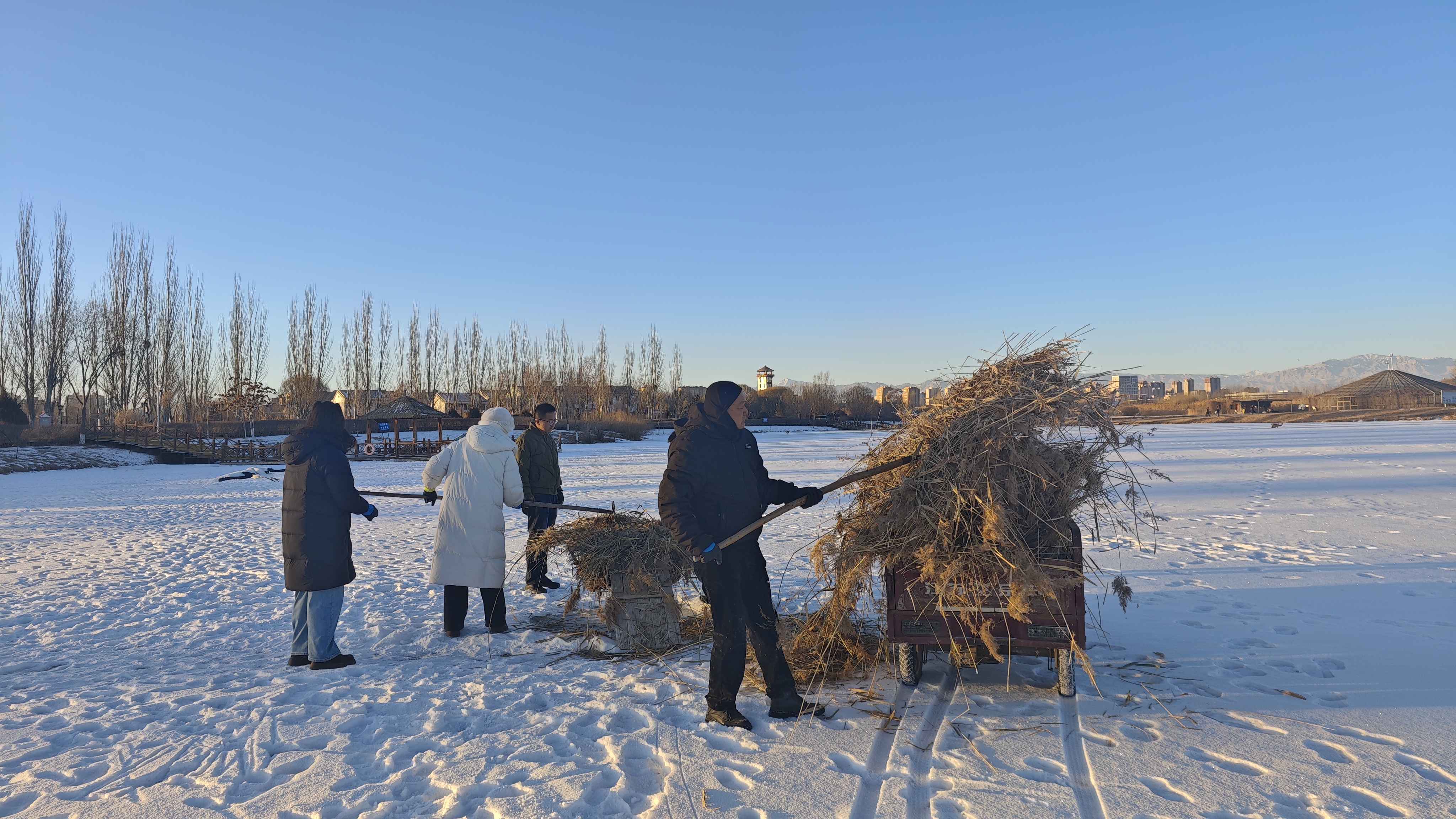 数九寒天,当张掖湿地公园鹤影湖的冰面被白雪覆盖,气温降至零下,在这里却有一群人干得热火朝天。他们搬运芦苇,在冰天雪地中有序地铺垫着人工鸟巢,用行动为即将到来的候鸟筑起一个个温暖的“安乐窝”。